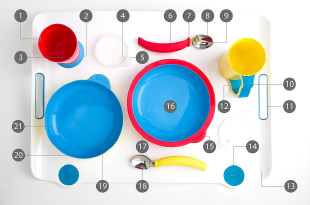 the bowls. In addition, the tableware set has holes with flaps at the edge of the tray where a napkin, bib or apron can be tucked to prevent spills. The set's drinkware